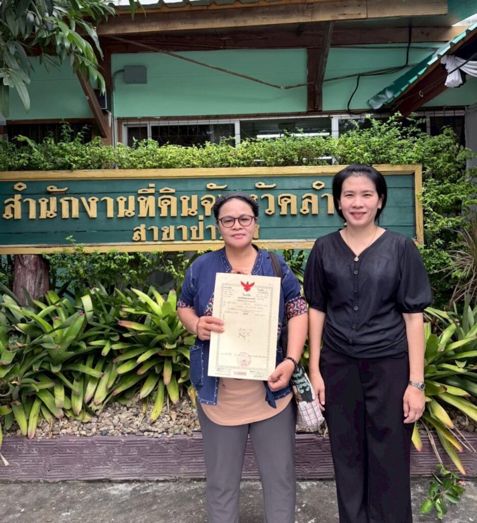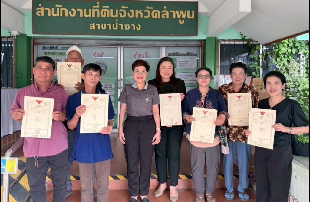 วันพุธที่ 25 กุมภาพันธ์ 2569 นางสาวสิริลักษณ์ อุตเถิน หัวหน้าสำนักงานกองทุนฟื้นฟูและพัฒนาเกษตรกร สาขาจังหวัดลำพูน พร้อมด้วยนางสาววรรณนิภา อกตัน พนักงานอาวุโส และผู้ปฏิบัติงานสำนักงานสาขาจังหวัดลำพูน ได้ดำเนินการโอนกรรมสิทธิ์หลักทรัพย์เป็นของกองทุนฟื้นฟูและพัฒนาเกษตรกร หลังจากที่สำนักงานกองทุนฟื้นฟูและพัฒนาเกษตรกรได้ซื้อทรัพย์คืน (NPL) จาก สหกรณ์การเกษตรป่าซาง จำกัด ให้กับเกษตรกร 7 ราย จำนวน 10 แปลง เนื้อที่รวมทั้งหมด 15 ไร่ 2 งาน 24.8 ตารางวา เป็นเงิน 2,835,007.95 บาท ณ สำนักงานที่ดินจังหวัด สาขาป่าซาง โดยเกษตรกร ได้ทำสัญญาเช่าซื้อทรัพย์สิน กับกองทุนฯ ระยะเวลาผ่อนชำระเงินคืน 15 และ 20 ปี โดยไม่มีดอกเบี้ย